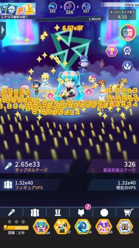 初音ミク-TAP WONDER- プレイ日記2日目 最高到達ステージ326 タップボルテージ2.65e33 フィギュアVPS1.32e40 15体まで解放しました。 タップは基本しないので、スキルはフィギュアのボルテージが上がる アンサンブルとスプラッシュエールを中心に上げていま…